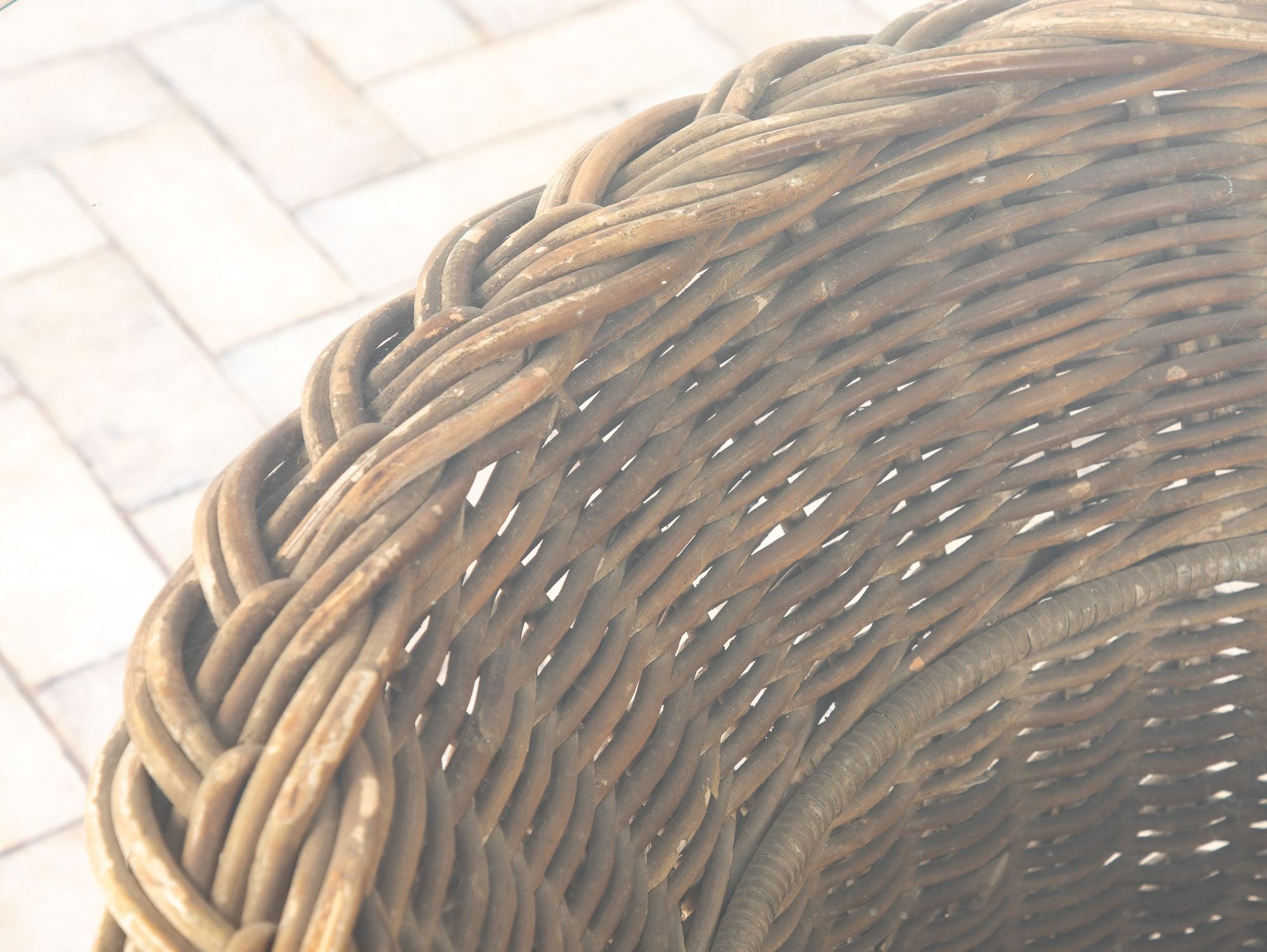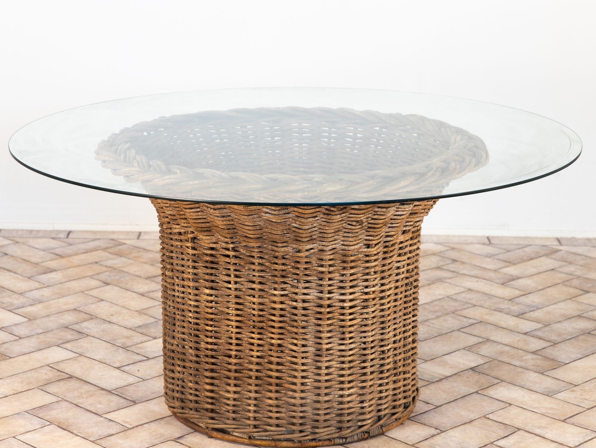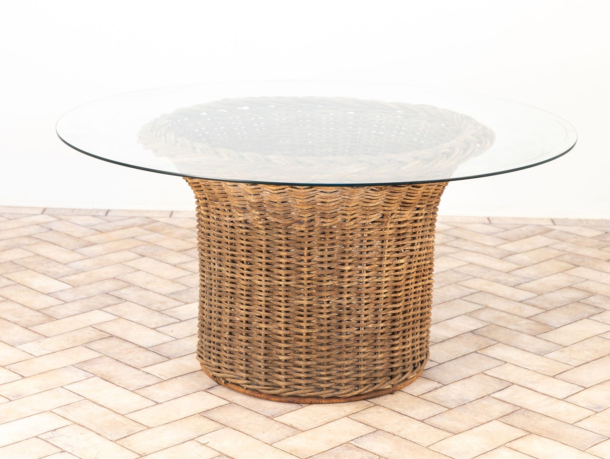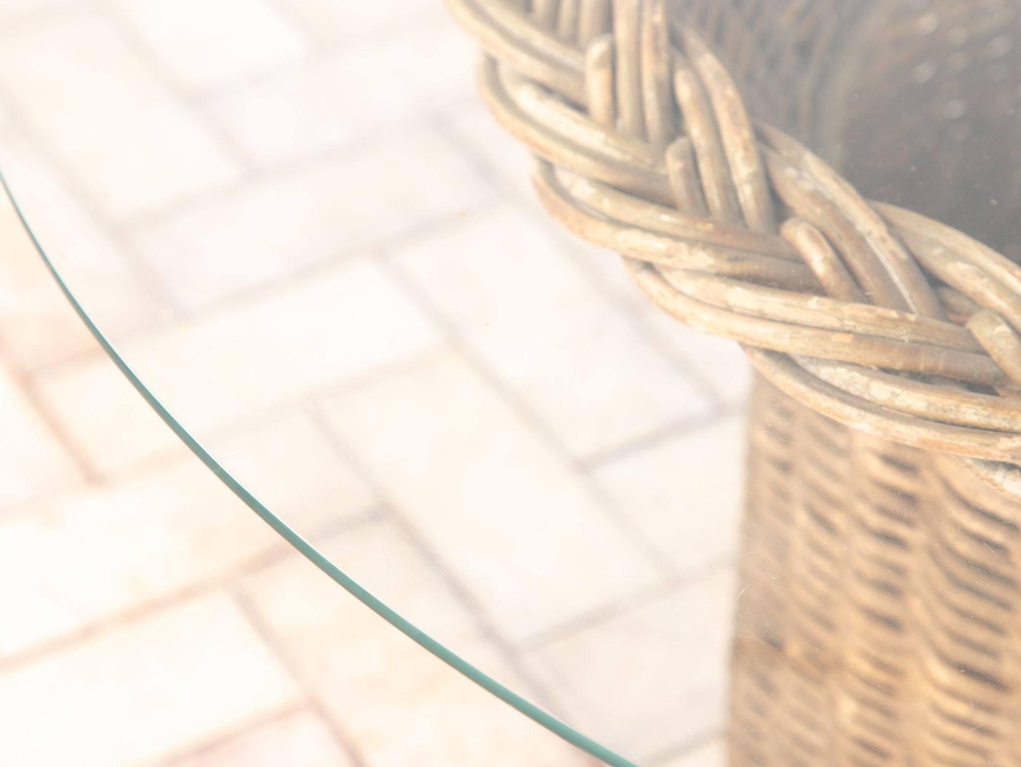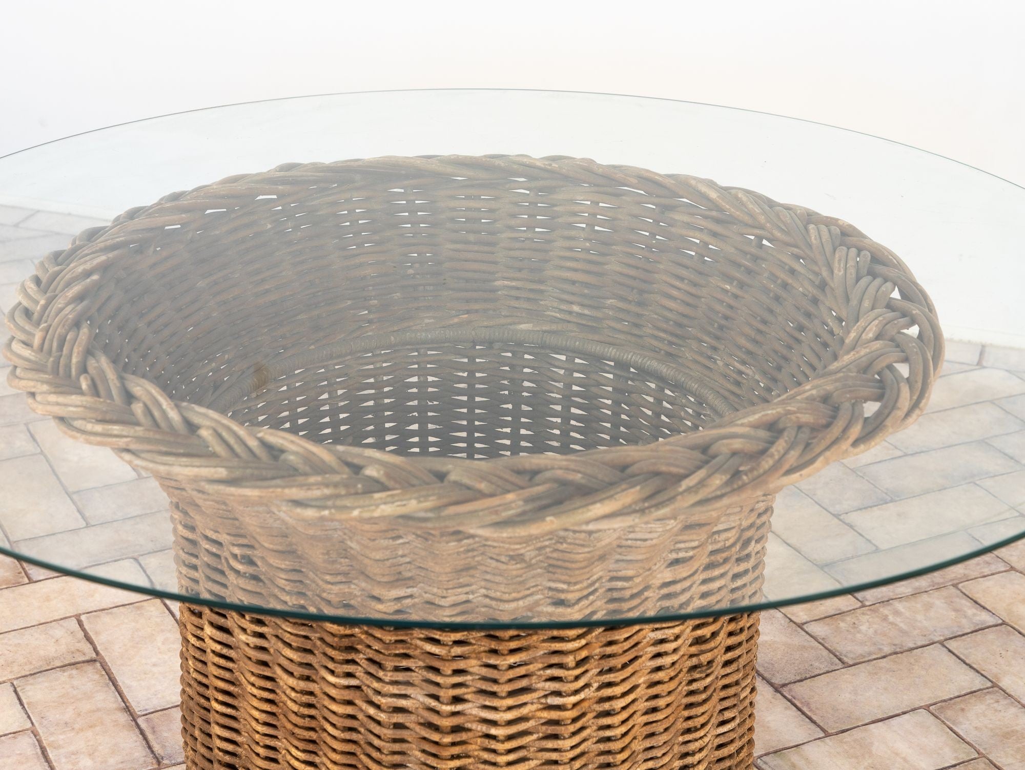 Vintage Round Wicker and Glass Side Table, France 1960s