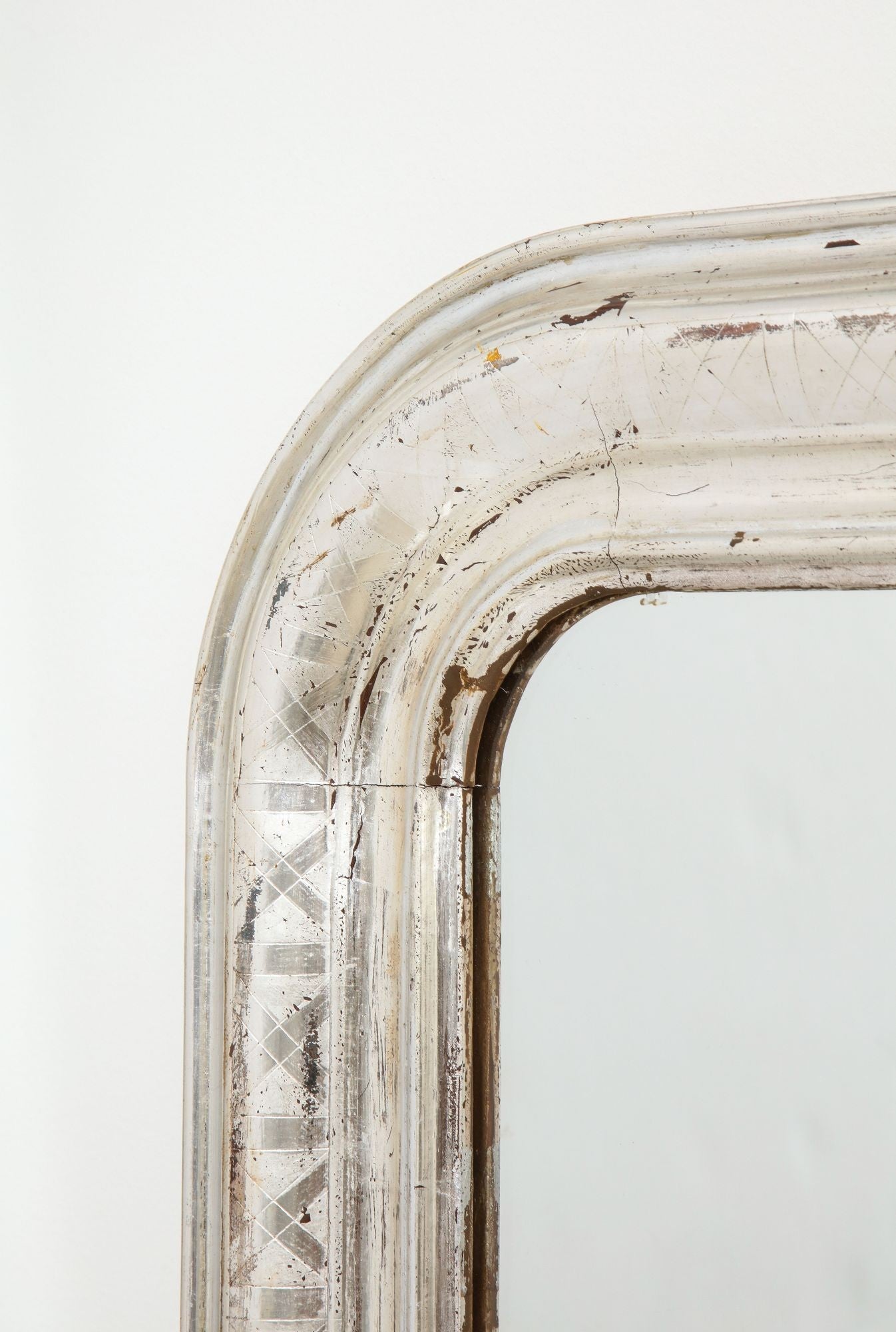 Brilliant Louis Philippe wall mirror with silver gilt frame made in France late 19th century. The frame has rounded upper corners that are typical of the Louis Philippe style. The mirror plate has been replaced. Generously sized, this statement piece would contrast nicely with an elegant dresser or console. Hang vertically in the bedroom or living room for a touch of drama.