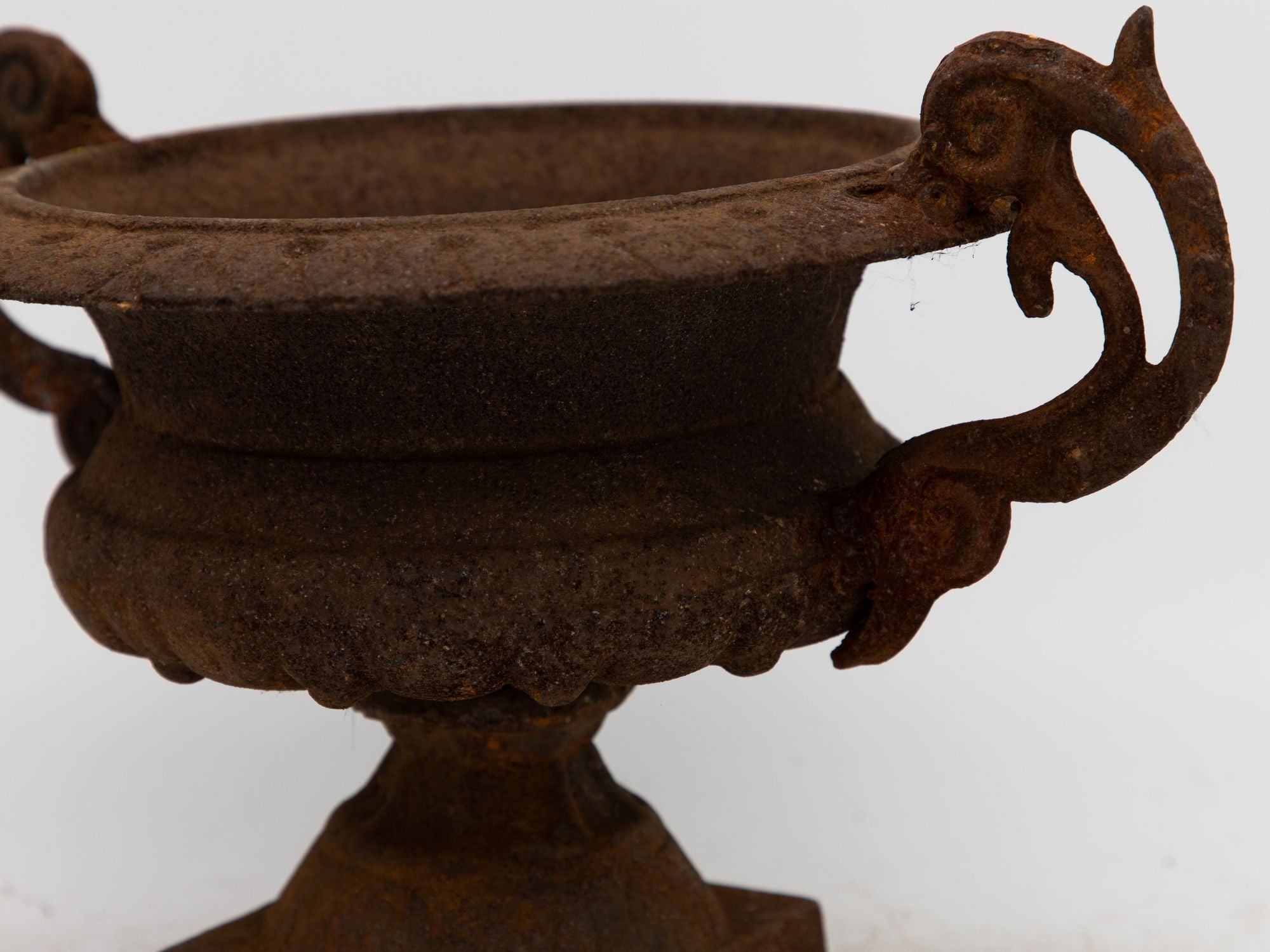 This pair of late 19th-century French cast iron garden urns exude timeless elegance and a rich history. Their aged, rusted patina bears witness to decades of weathering, adding authenticity to their charm. The unique lambs tongue pattern on the lip of the urns sets them apart, with the matching pattern around the vase, standing on square bases, adds a touch of traditional sophistication. Two prominent handles fashioned in the style of acanthus leaves provide both functionality and decorative appeal. These garden urns are not only functional pieces but also works of art, offering a glimpse into the grace and craftsmanship of 19th-century French design. 15"w x 10.5"d x 9.5"h