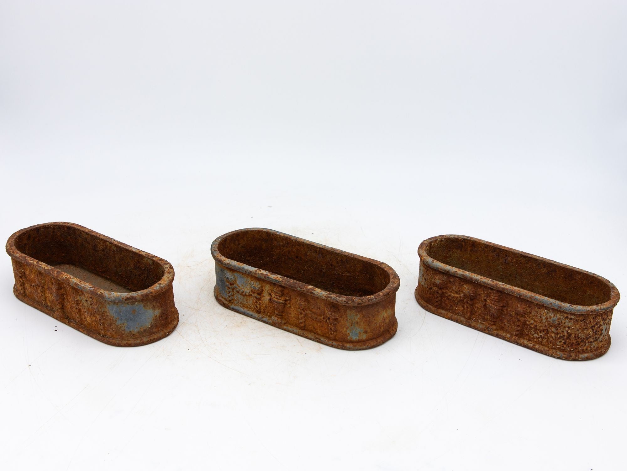 This French late 19th-century or early 20th-century small cast iron planter embodies Neoclassical elegance in a compact, oval shape. The planter features intricate detailing on each side, with a central lidded urn and handles on each side, flanked by twisted swags held by rosettes. The piece boasts a beautifully aged patina, showcasing remnants of its original finish. With wear consistent with its age and use, this planter has a charming and sophisticated accent that is perfect for adding a touch of historical charm to any space. Three available, sold separately. 8.5"w x 3.5"d x 2.5"h